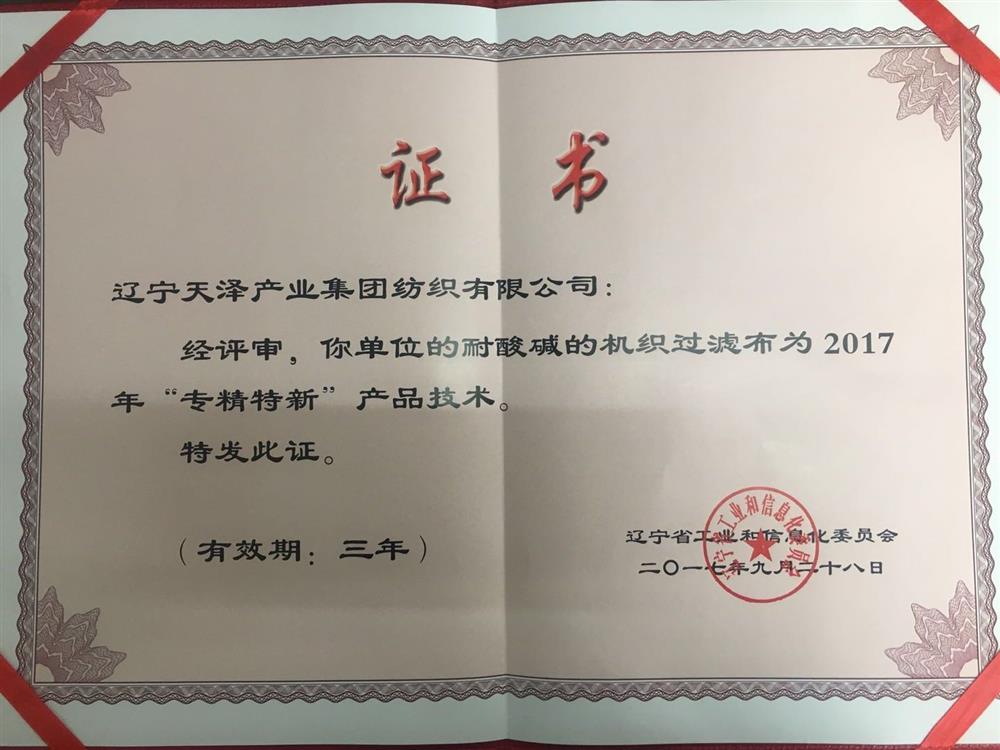 耐酸堿的機制過濾布”和“混紡導電紗及其防靜電過濾布”獲遼寧省2017年中小企業“專精新特”產品技術